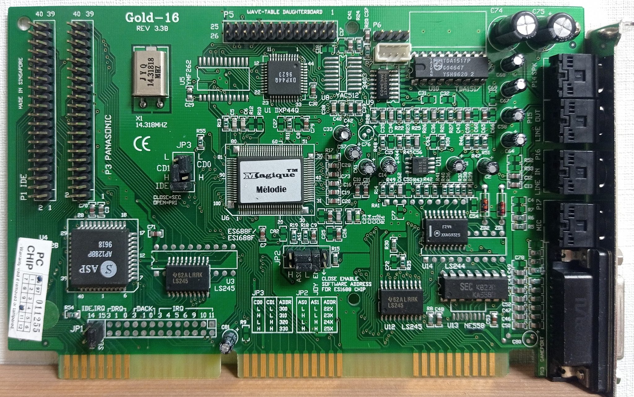 Загадочная в силу своей редкости звуковая карта, выпущенная в 1992 г. в Сингапуре компанией Wearnes Multimedia Labs. Печатная плата, вероятно, изготовлена в Гонгконге (судя по гравировке на медном слое обратной стороны платы). Наклейка с FCC ID JUGMML9010 отсылает к Multi-Media Audio Card (Wearnes Peripherals Intl (PTE) Ltd). На удивление, Интернет, который всё помнит, про эту плату больше ничего не знает. Описания джамперов и разъемов нет, драйверов и ПО — тоже. Указанный производитель выпускал как минимум еще одну модель звуковой карты (совершенно другую по железу), занимался выпуском CD-ROMов, системников и периферии, но к настоящему времени совсем ушел с рынка ПК, как будто бы не оставив практически никаких доступных архивов ПО и документации.