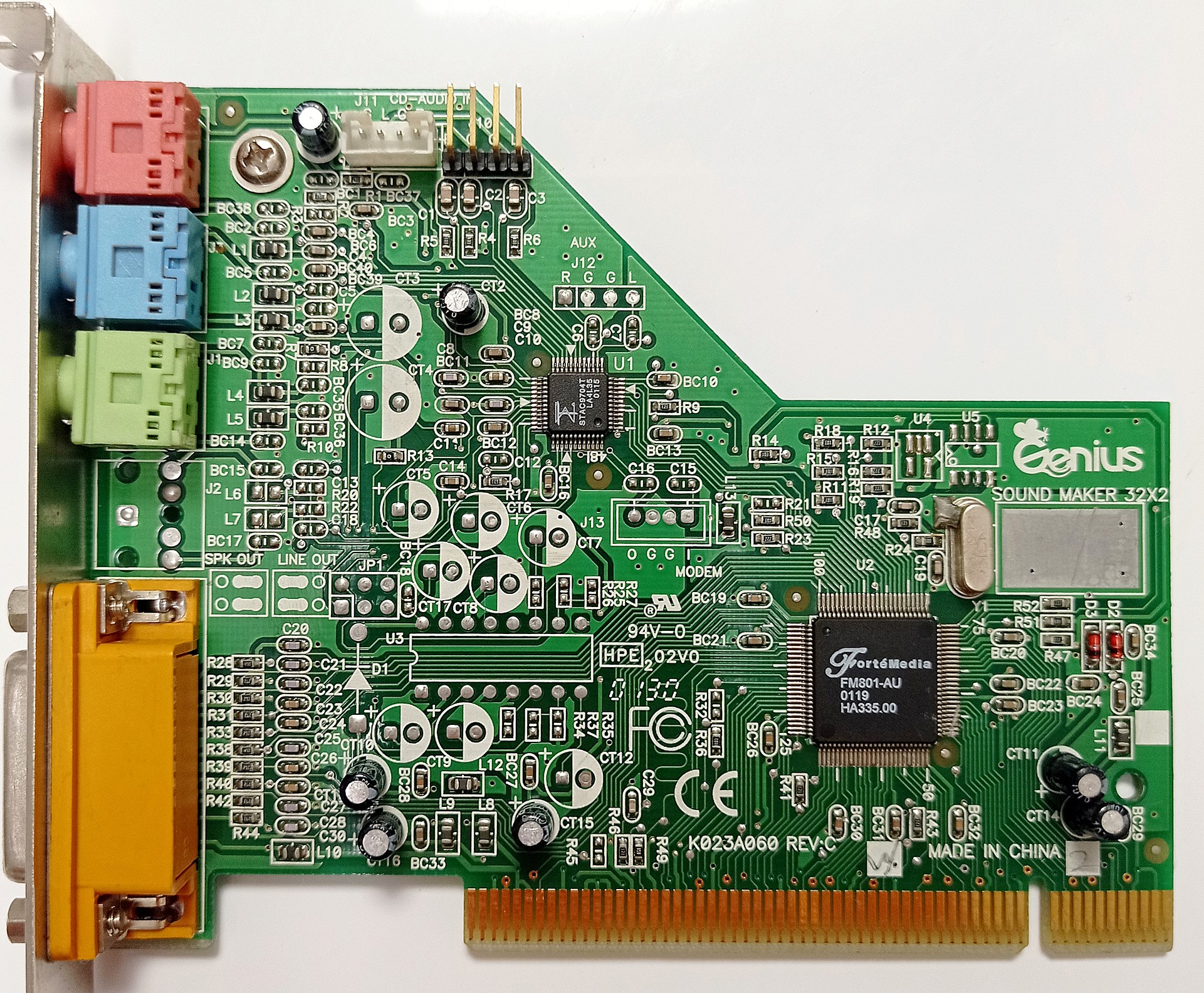 На первый взгляд — это обычная для 2000 г. звуковая карта, с неплохим аудиоконтроллером Yamaha YMF744 (4-канальный DS-XG). Но через секунду обращает на себя внимание отсутствие чипа кодека AC’97, необходимого для получения какого-либо звука от вышеупомянутого контроллера. А если присмотреться, то и краска на чипе немного расплывшаяся (хотя сам стиль маркировки практически не отличим от оригинала, не считая выравнивания), а сам корпус чипа несколько толще ямаховского.