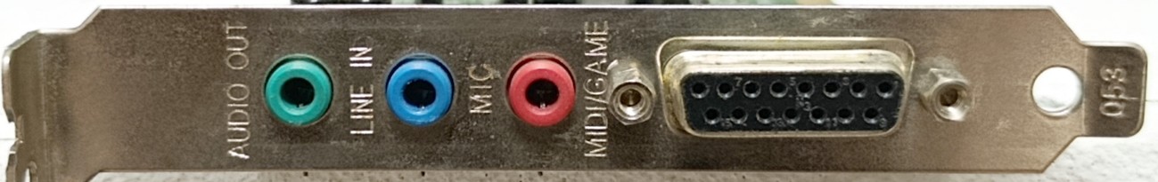 Внешние соединители (c цветовым кодированием): 3,5 мм стерео коммутируемый линейный выход или выход со встроенного усилителя, 3,5 мм стерео линейный вход, 3,5 мм моно микрофон (конденсаторный), разъем для игрового манипулятора с контактами MIDI-порта.