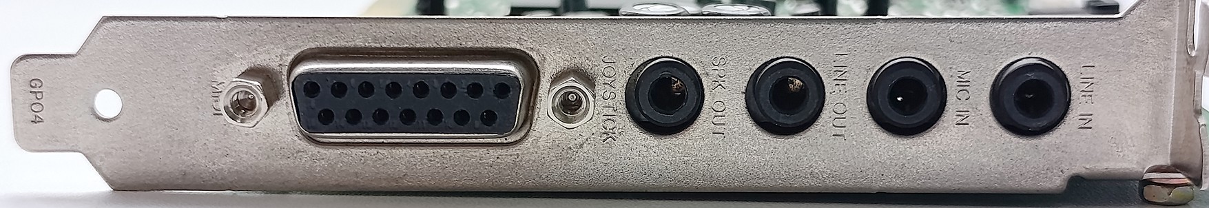 Внешние соединители (без цветового кодирования): MIDI/Joystick; усиленный выход; линейный выход; микрофонный вход; линейный вход.