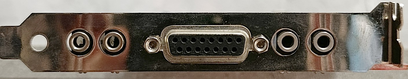 Внешние соединители (слева направо) — линейный вход, микрофонный вход, джойстик/MIDI, линейный выход, усиленный выход на колонки.