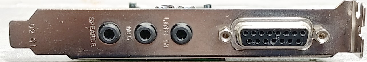 Внешние соединители (без цветового кодирования): 3,5 мм стерео выход, 3,5 мм моно(?) микрофон, 3,5 мм стерео линейный вход, разъем для игрового манипулятора с контактами MIDI-порта.